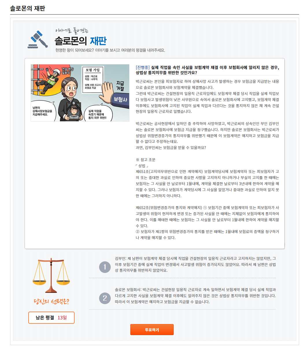 일상생활에서 발생할 수 있는 여러 사례에 대하여 누구나 직접 판결에 참여해 볼 수 있는 국민참여형 법령서비스 "솔로몬의 재판"에 참여해 주세요. 추첨을 통하여 소정의 선물도 받을 수 있습니다.