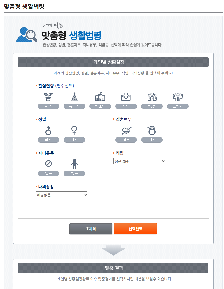 ✔️ 본인의 연령대, 성별, 결혼유무, 직업을 입력하면 현재 나에게 필요할 수 있는 생활법령을 찾아서 제시해 주는 개인별 맞춤형 법령정보를 찾아볼 수 있습니다.